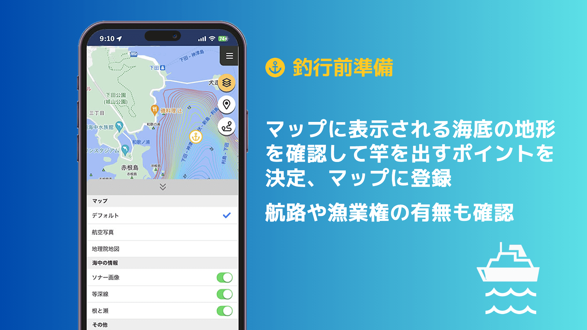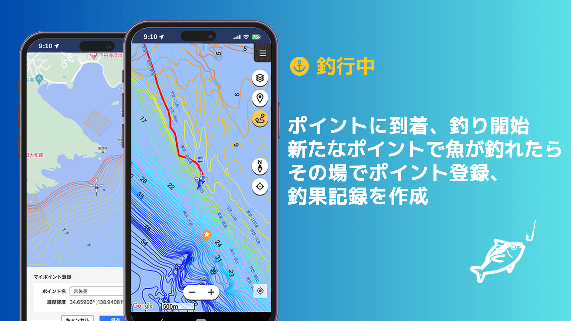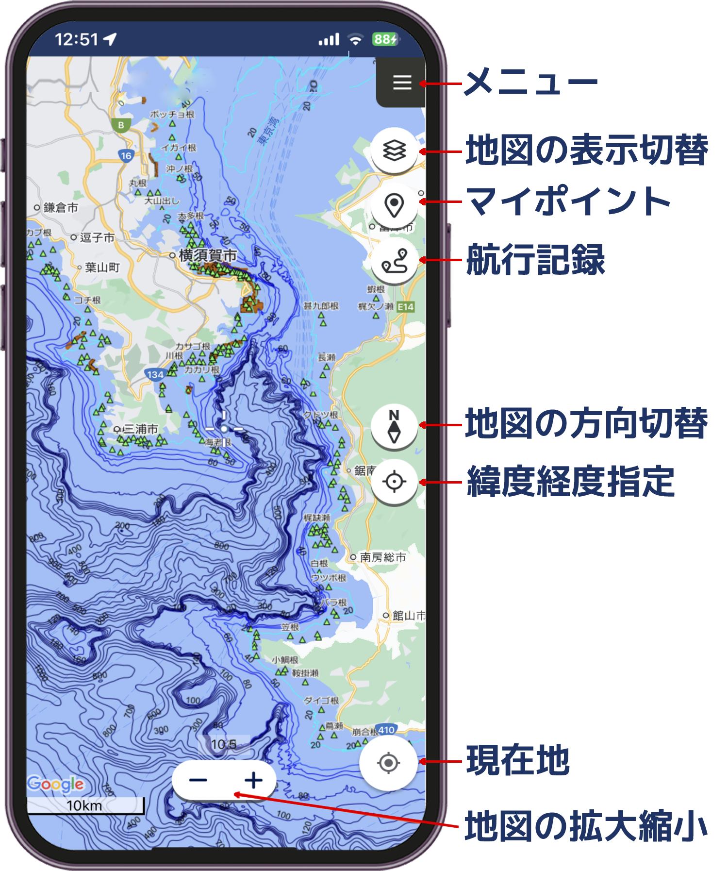 | 等深線による海底地形図の表示 | ○ | ○ | 釣りナビくんプレミアム |